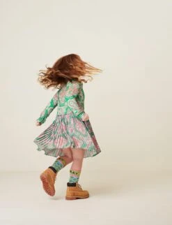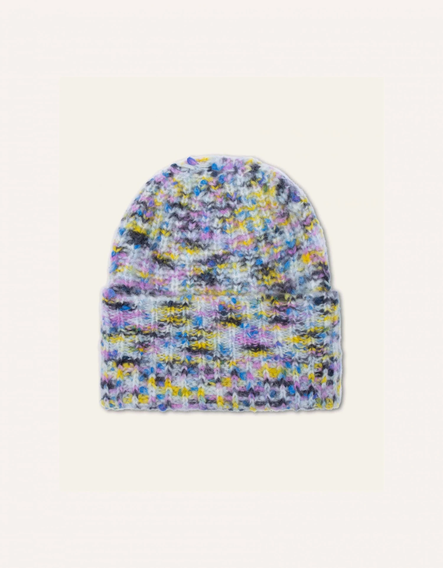De speelse melange van kleuren en wolsoorten maken deze muts een gezellige, warme toevoeging aan je garderobe.