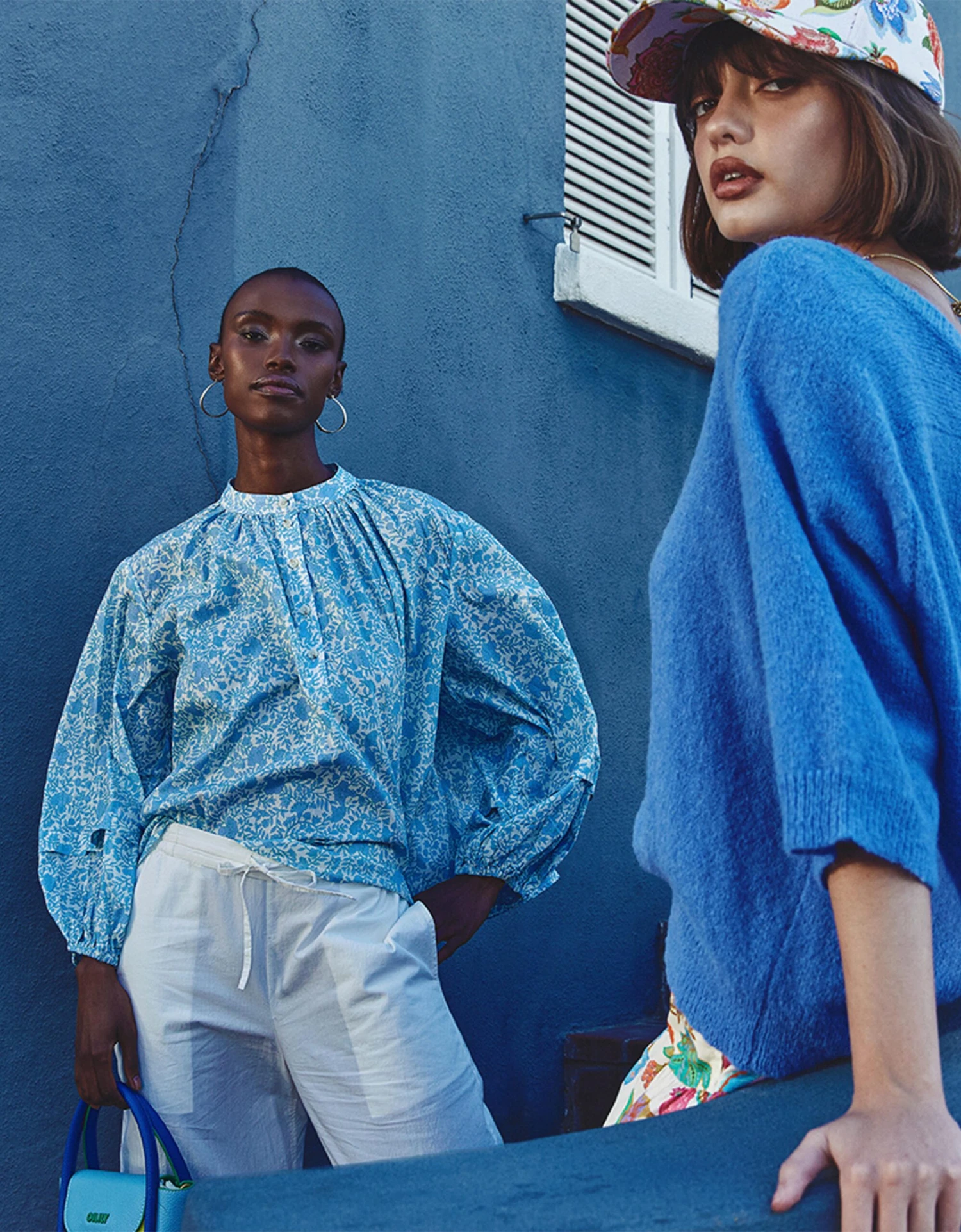 Deze heerlijke luchtige farmer’s blouse in bloemendessin heeft wijde mouwen en elastische manchetten. Door de speelse plooi op de mouwinzet krijg je extra volume. De platte kraag sluit met parelmoeren knoopjes die doorgaan tot halverwege.
