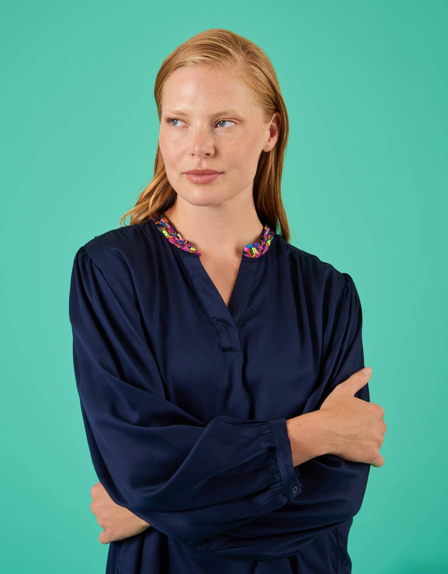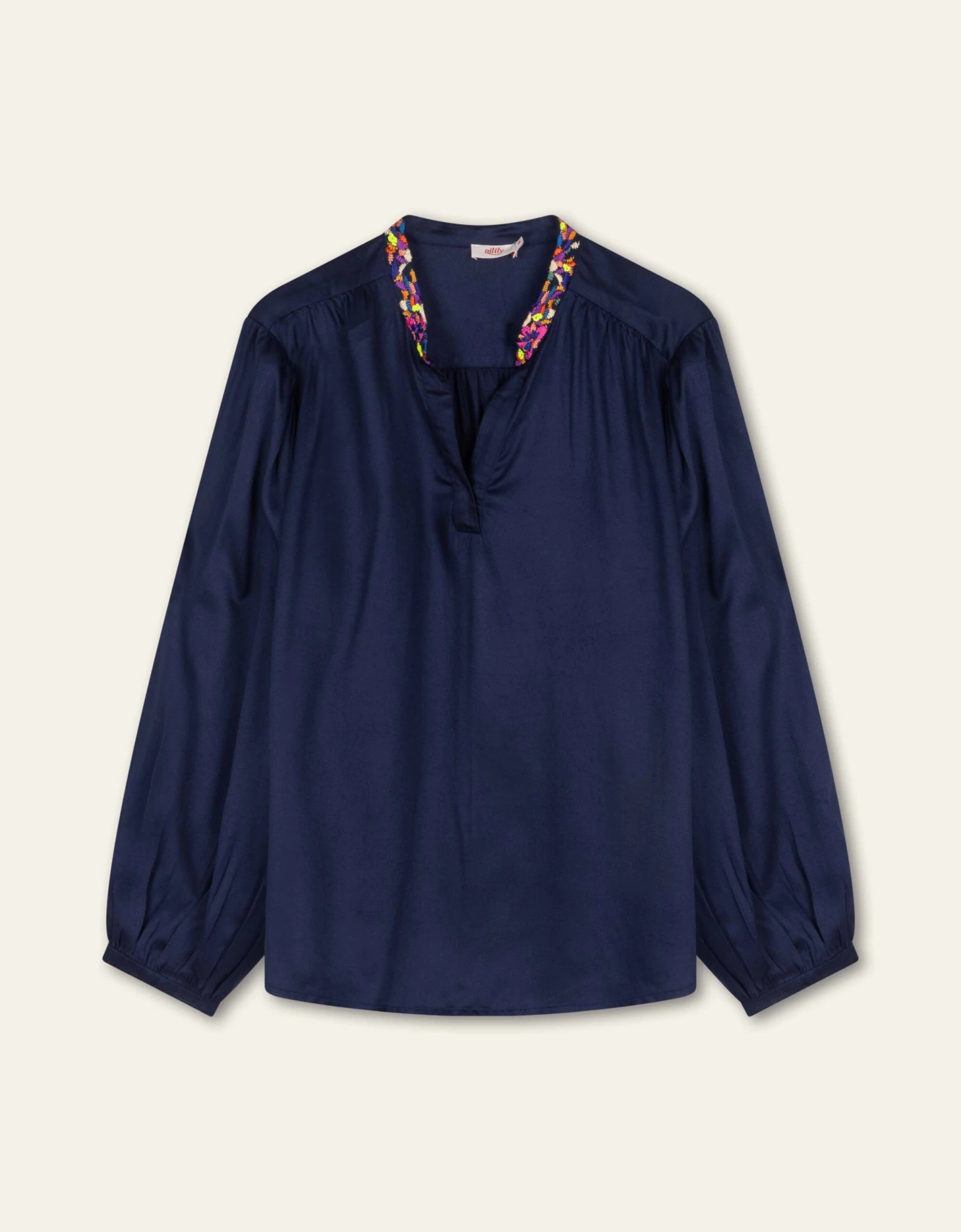 Multikleurige pailletjes prijken langs de V-hals van deze luchtige blouse met volumineuze ballonmouwen.