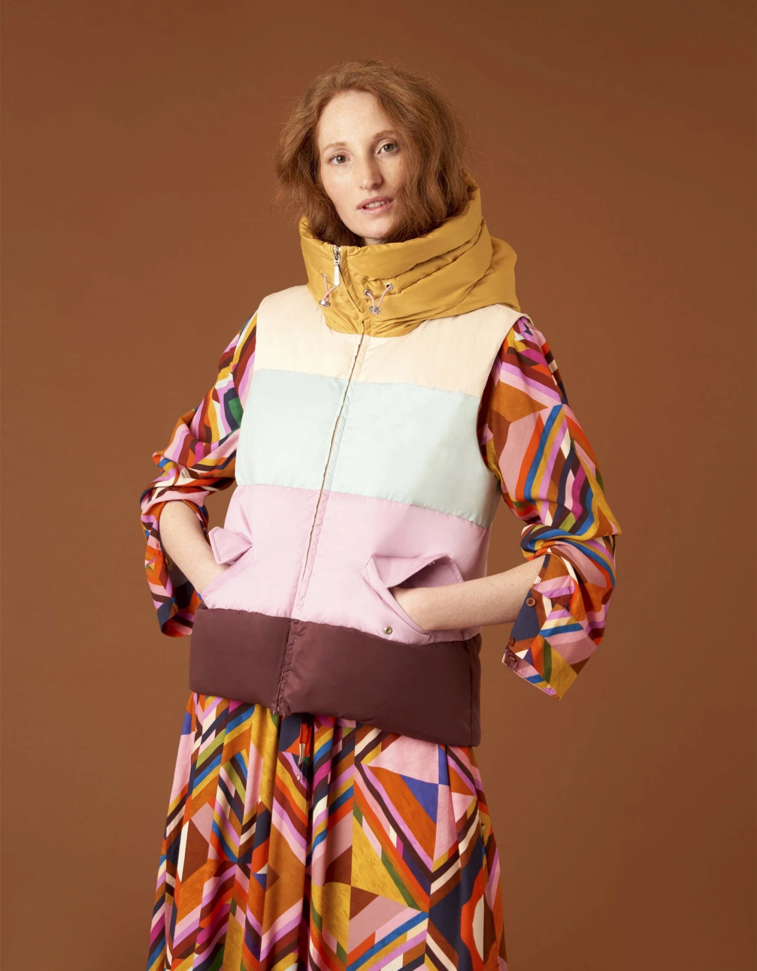 Colourblock bodywarmer dat heerlijk puffy is en je prettig warm houdt. Aan de binnenkant vind je zijdelings van de rits een Oilily-merk lint. Andere speelse details zijn de oversized capuchon met grote kraag, de Oilily badge op de borst en de ruime zakken met kleppen.