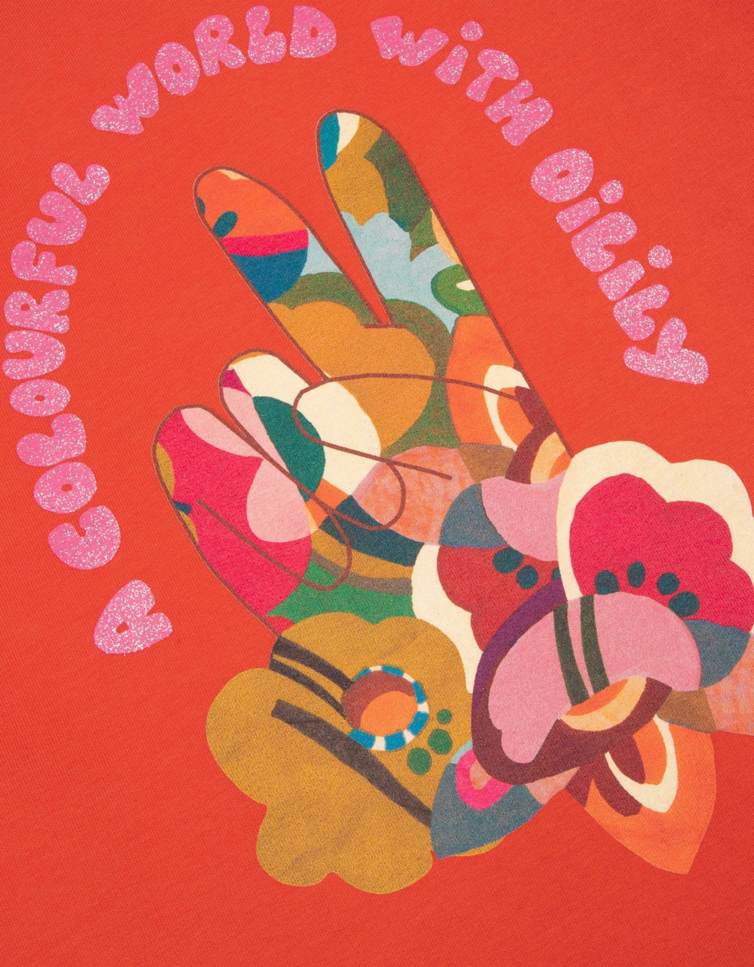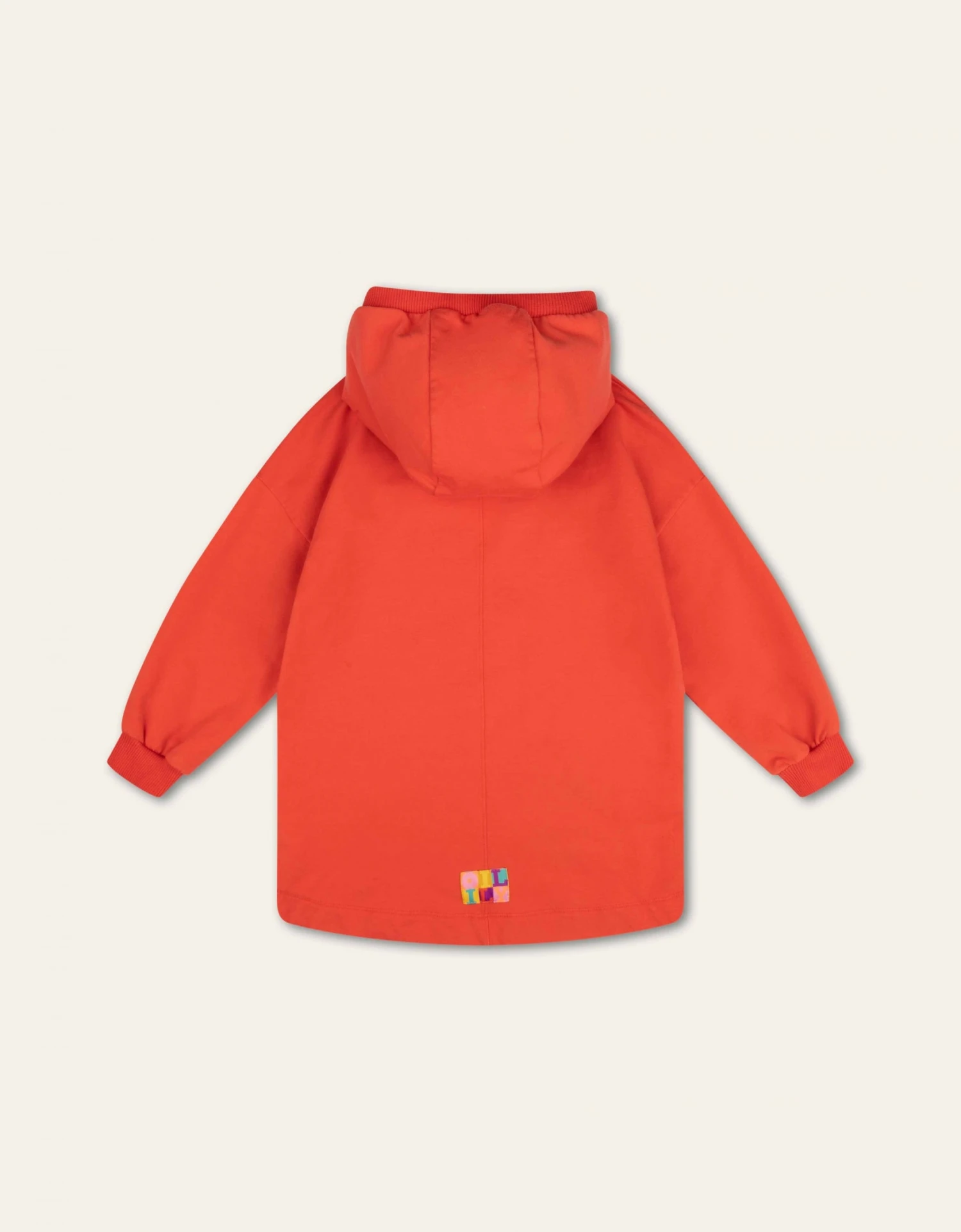 Vrolijkheid en comfort komen samen in deze lekkere sweaterdress in Oilily rood. De mouwen zijn lekker los, de capuchon prettig ruim en op je buik een prachtig kunstwerk vol kleuren.