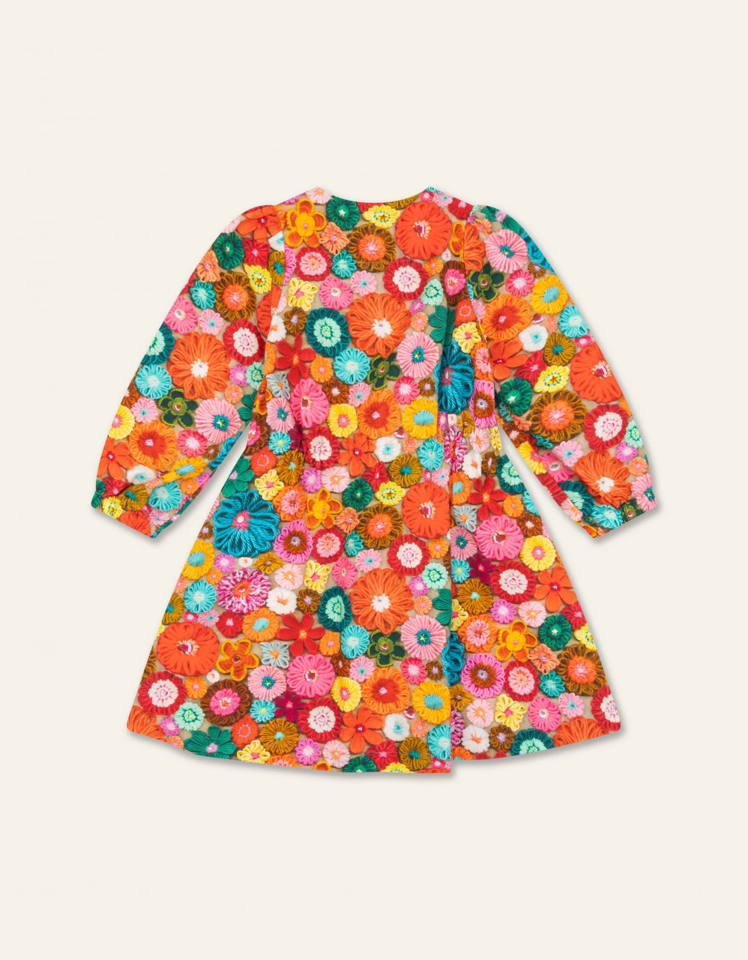 We haakten bloemen, groot en klein, in allerlei kleuren als basis voor dit vrolijke dessin. Geprint op deze jurk van comfy organisch katoen straal jij als een fluffy boeketje.