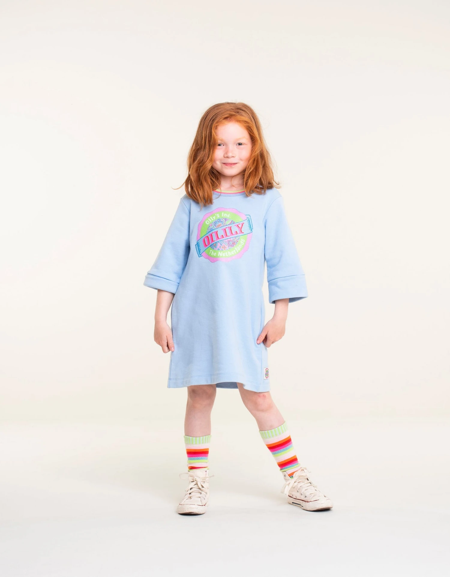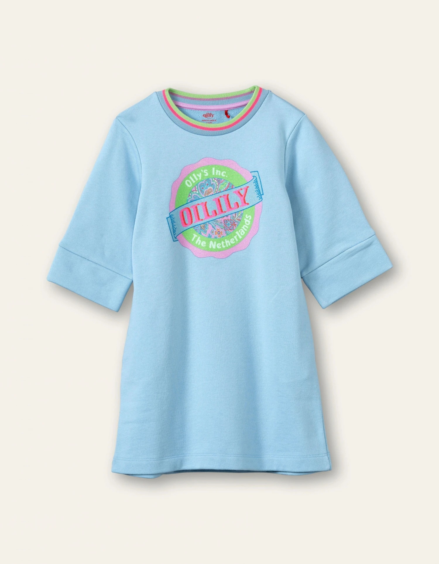 Dit zoete sweatjurkje is zo blauw als de lucht en zo vrolijk als een zakje snoep. Korte, opgerolde mouwen, ruime steekzakken, kleurrijke crewneck en een gezellig glitter vintage Oilily logo in het midden vormen samen het recept voor jouw nieuwe lievelingsjurk. – Relaxed fit – 100% organisch katoen – Gemaakt in Griekenland