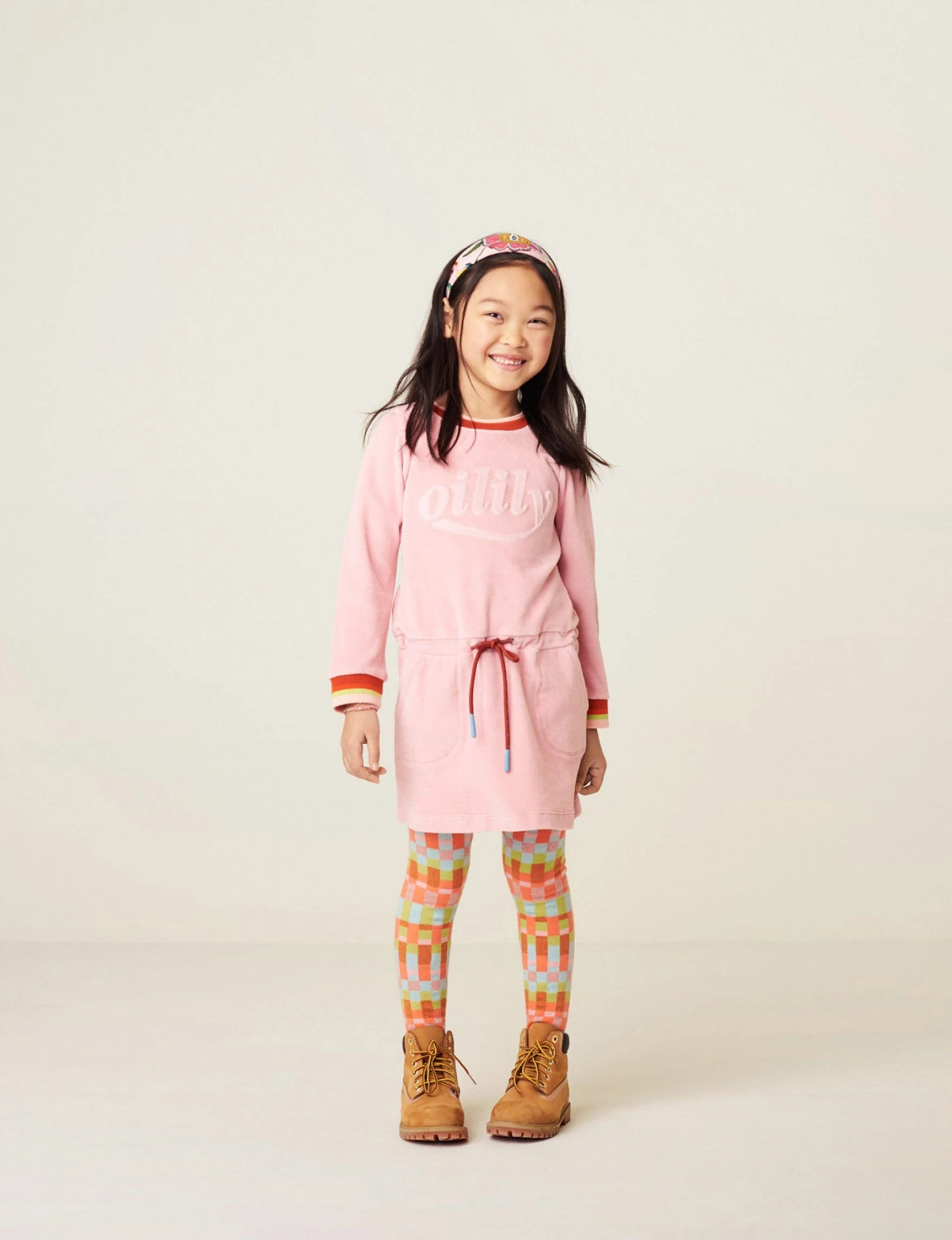 Wat een heerlijke jurk is dit om eindeloos te dragen. Heerlijk zacht velours, coole glitter crewneck, pofmouwen en ook nog een 3D-logo op je buik. – Gemaakt in Griekenland – Organic cotton – Drawstring en zakjes bij de taille – Vintage logo aan de achterkant