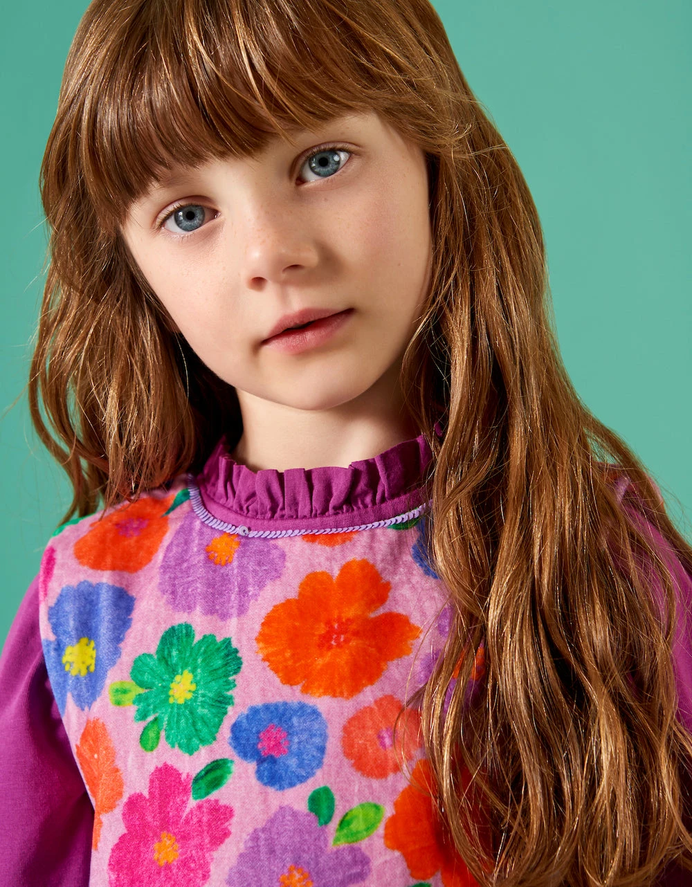 Dit jurkje is heel bijzonder. Het dessin Mush Flowers maakten we door plastic zakjes met water en lucht te vullen, ze in de verf te dopen en ermee te stempelen tot er een bloempatroon ontstond. Het staat beeldig op deze velours jurk met satijnen voering en kleine pailletten langs de hals.