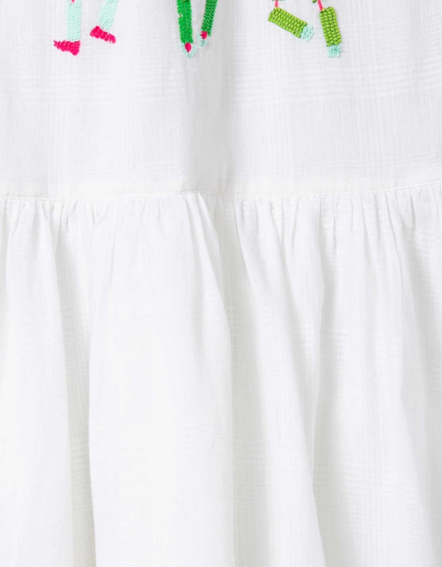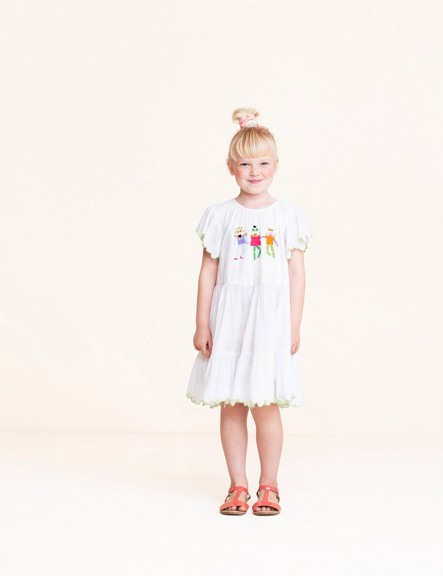 Houd je van dagdromen, zittend op een wolk, de hele dag suikerspinnen eten terwijl je bloemetjes plukt voor in je haar? Deze prachtige jurk is perfect voor dagdromertjes. Super zacht katoen, prachtige ronde vormen langs de zoom en met handgeborduurde robo-engeltjes die altijd met je mee willen.
