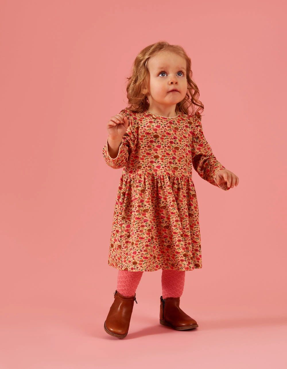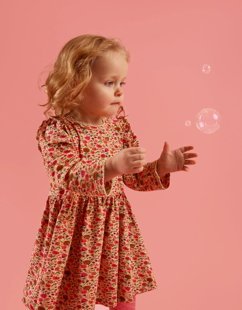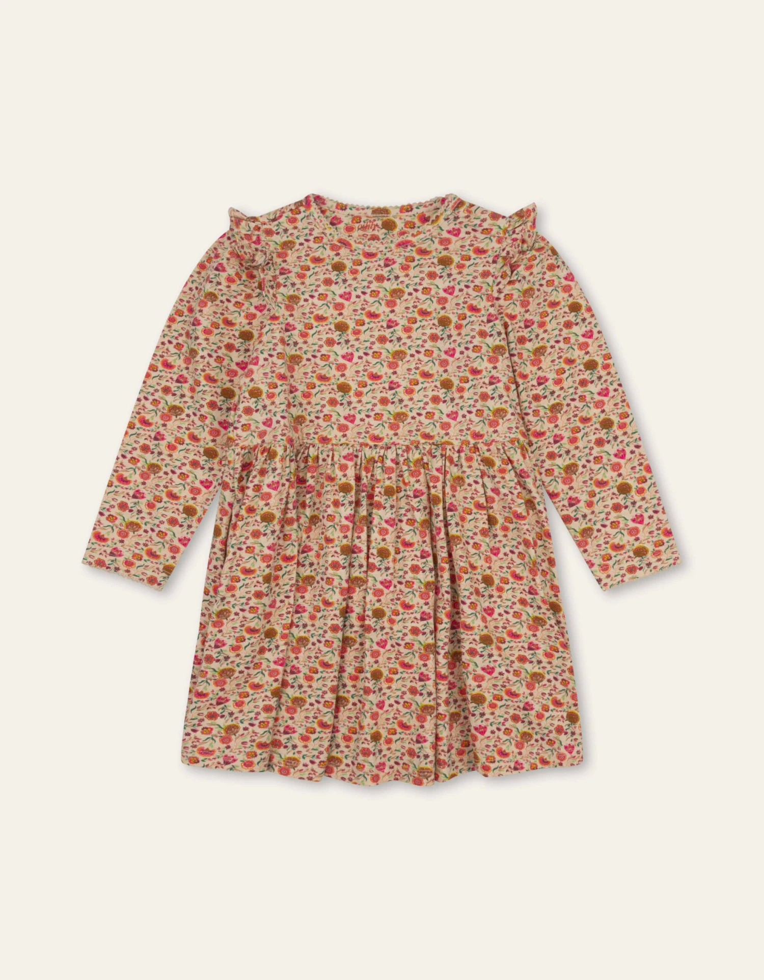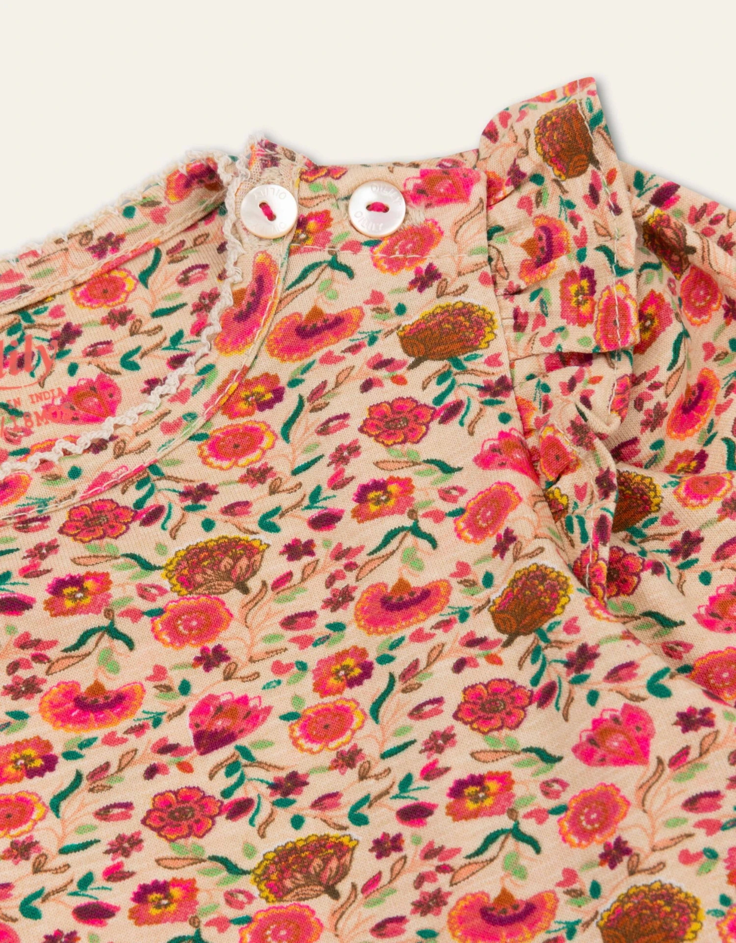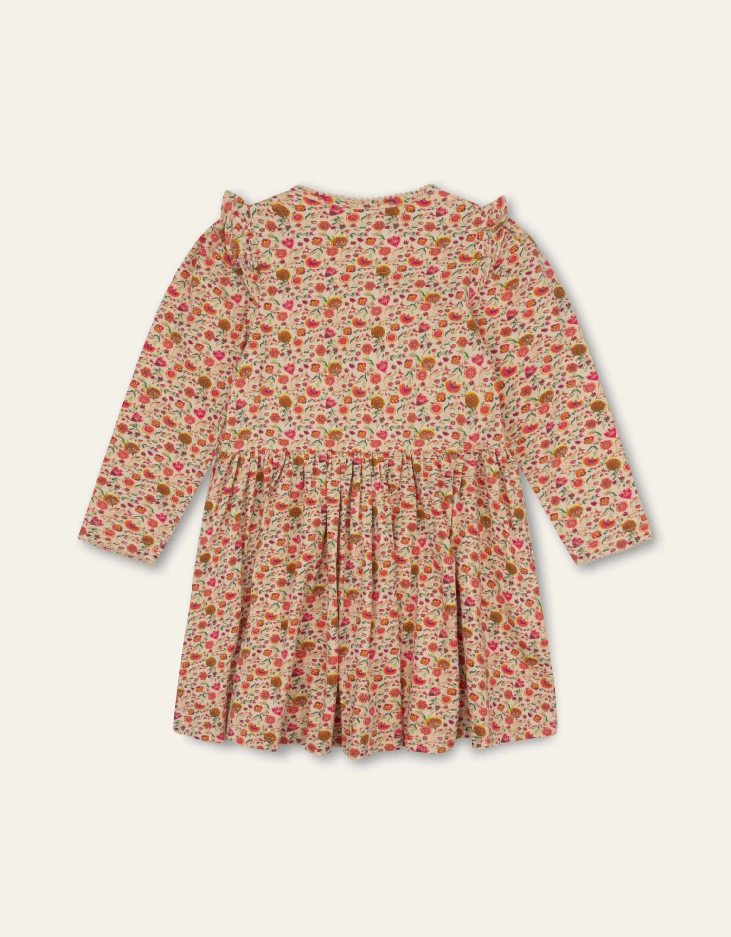 Lily is een lieflijk bloemendessin dat beeldig past bij deze katoenen jurk. De Mother of Pearl knoopjes glanzen mooi bij dit jurkje. Met picot stitch langs de hals en details op de schouders.