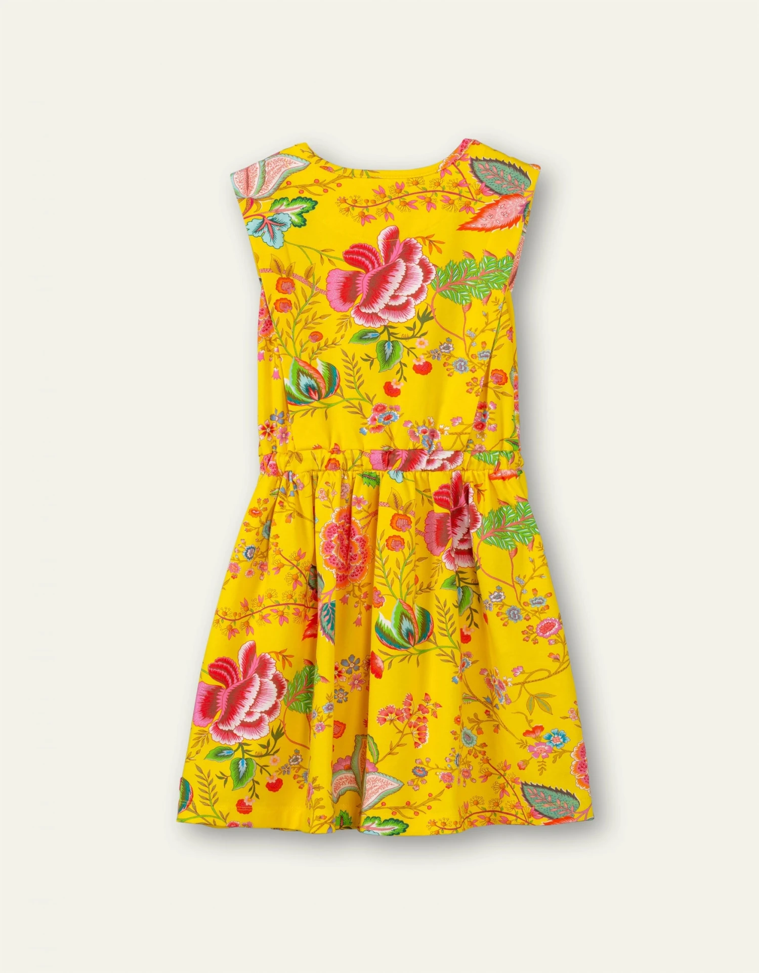 Frisse, flora-fun in deze fijne zomerjurk met speelse, folkloristische vouw aan de voorkant, taillekoord en geinige zakjes in de zij. In heerlijk geel met onze iconische Sits bloemen uitgevoerd. – Organisch katoen met elastaan – Regular fit – Gemaakt in Portugal