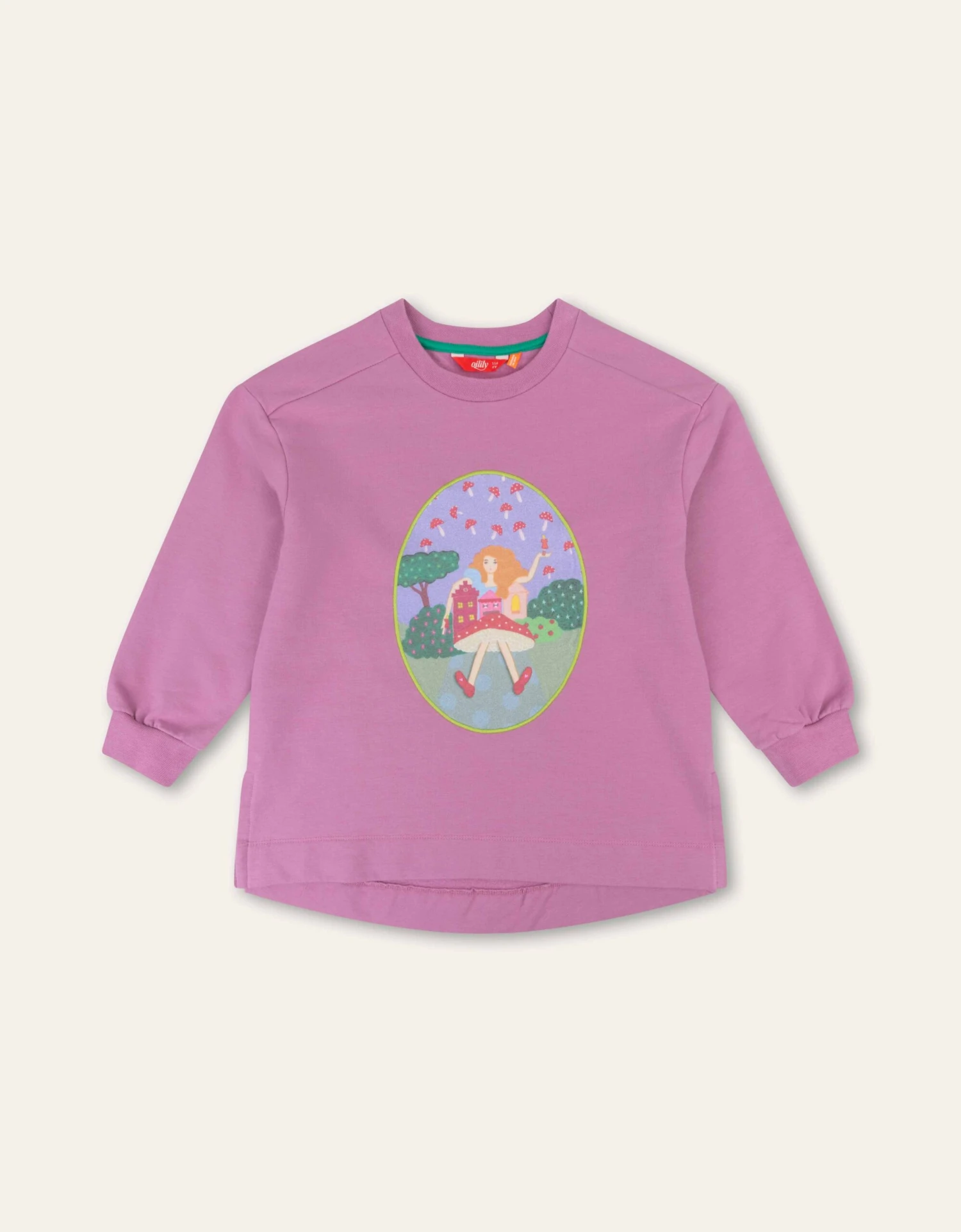 Hey, kijk eens daar is Alice in haar Wonderland van paddenstoelen. Met grappige huisjes om haar heen en kleine paddenstoelen die als druppels om haar heen vallen. Samen kunnen jullie op avontuur in deze trui met een wat langere lengte.