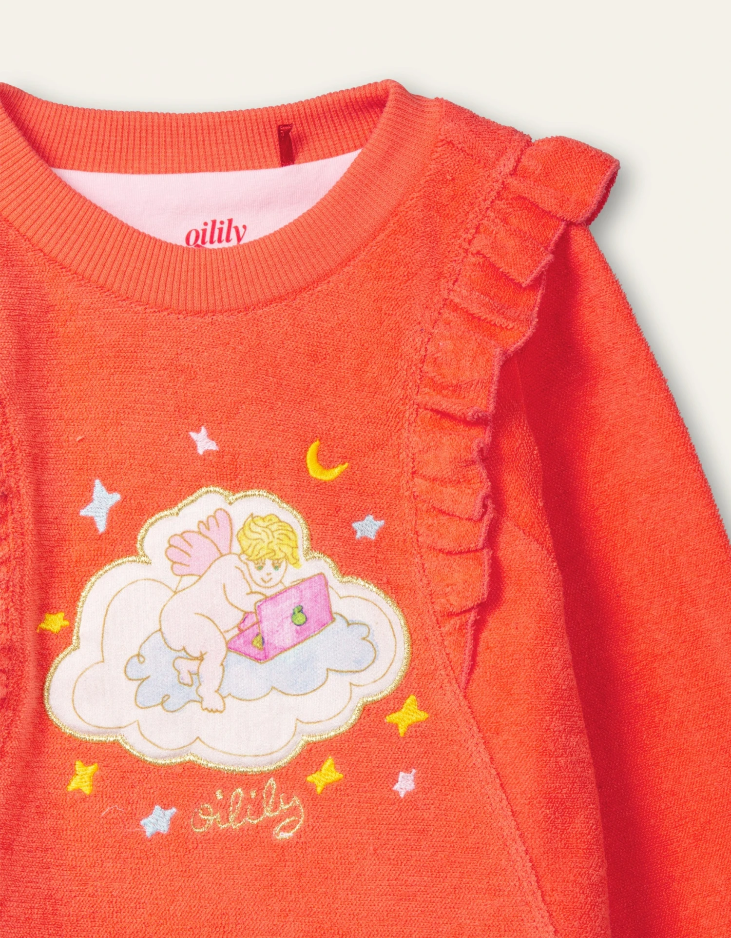 Trui in bio-katoenen stof in onze favoriete kleur deze lente: koraal rood. Met een schattige tekening van een engel aan het werk op een wolk omringt door geborduurde sterren en de maan.