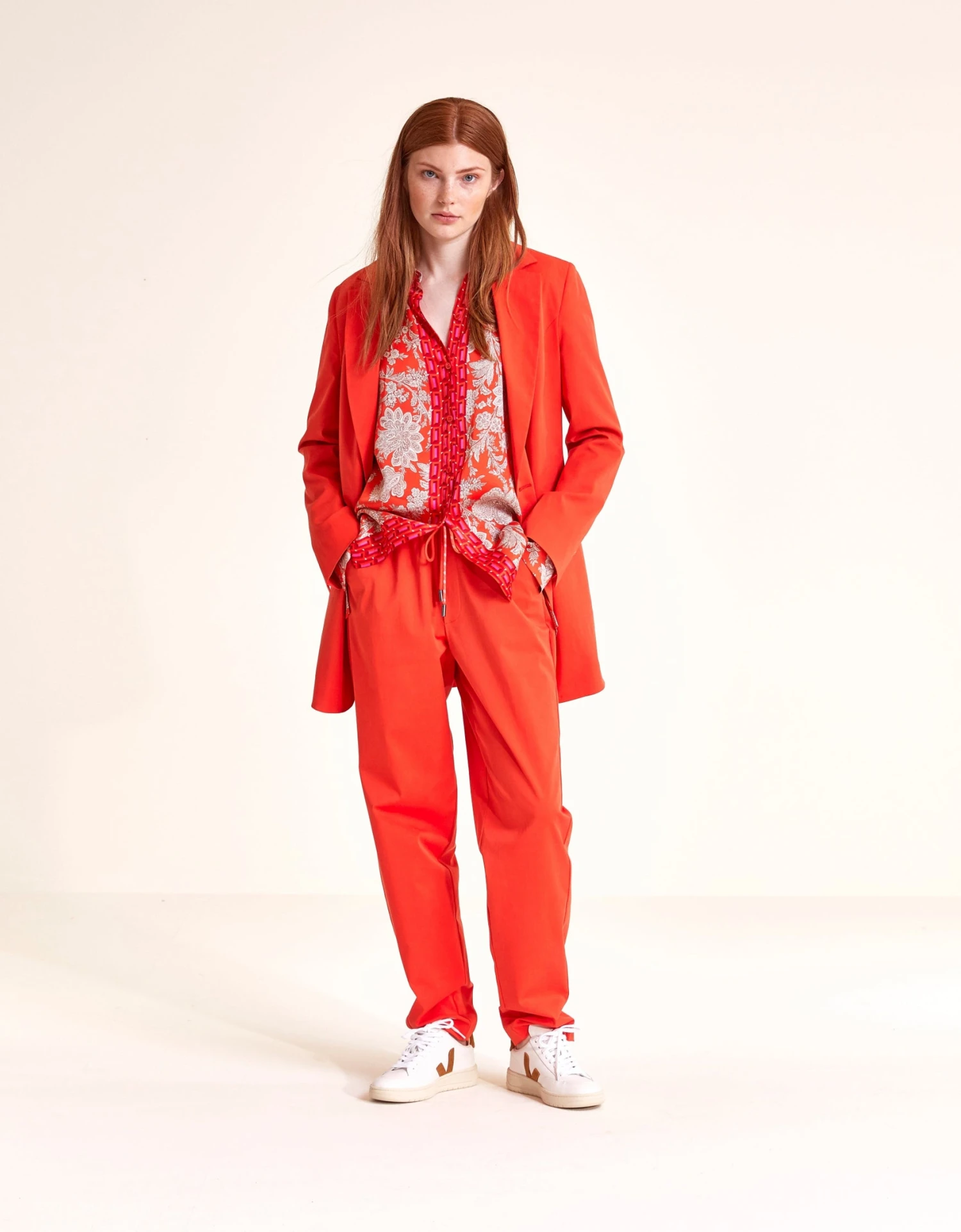 We zijn zo blij met dit jasje dat deel uitmaakt van een heus Oilily pak. Gemaakt van cherry tomato-gekleurd tencel met een prachtige blauwe voering en een speelse verborgen boodschap aan de binnenkant. De bijpassende ceintuur en knopen vormen samen de perfecte sluiting.