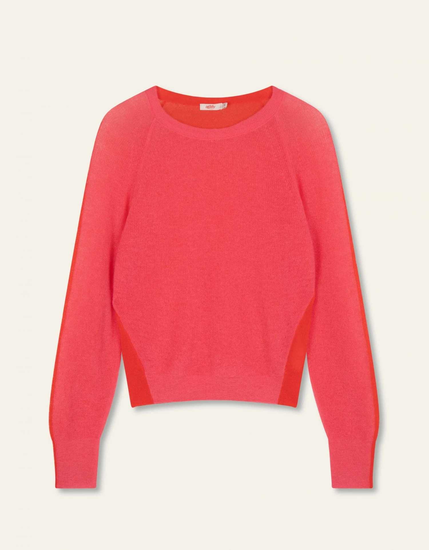 Een beetje mohair maakt deze trui net wat zachter en heerlijk ademend in de lente. Door het gebruik van colourblocking is dit een echte speelse eye-catcher. Hang het niet op, maar leg dit item op een plank in je kast om de vorm mooi te houden. – Wolmix met o.a. mohair