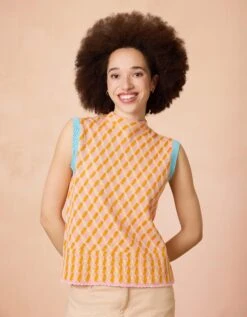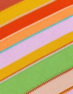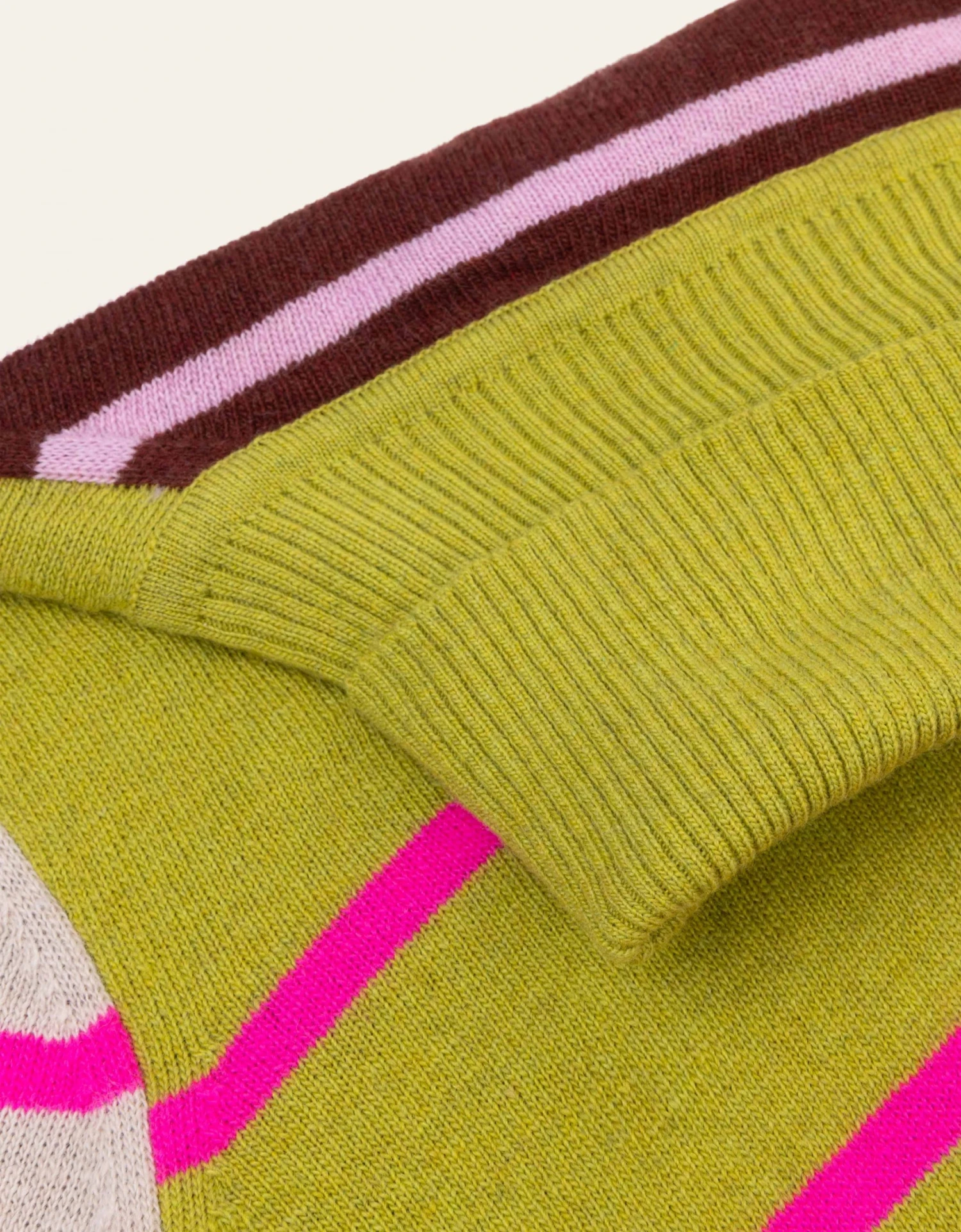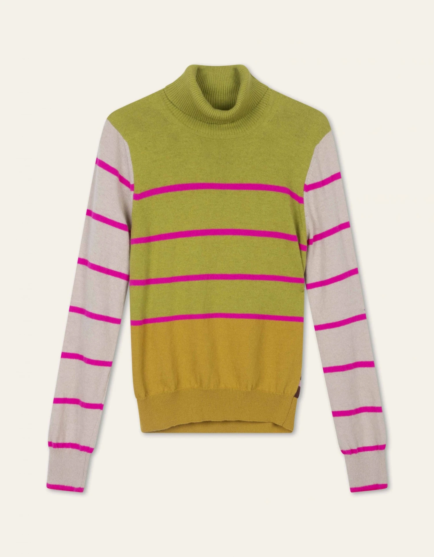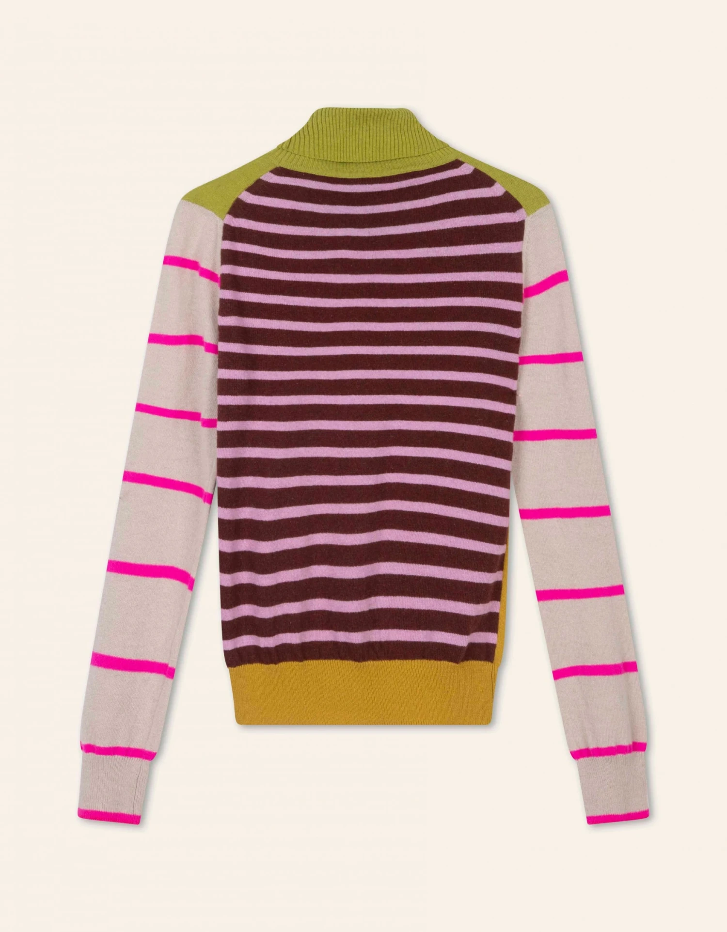 Vrolijke fitted pullover met een patchwork van strepen die je lekker warm houdt. De grote double-knitted col staat en zit erg prettig.