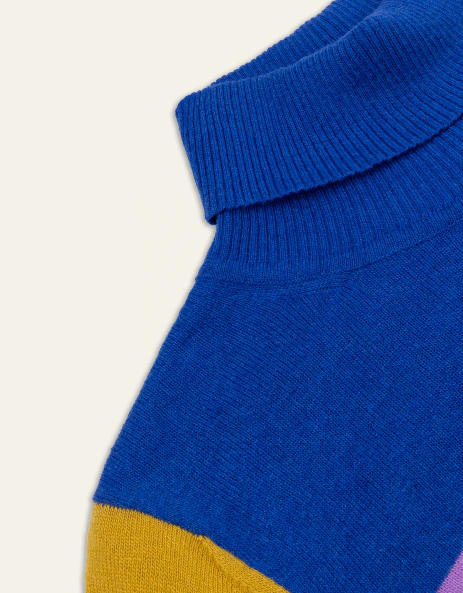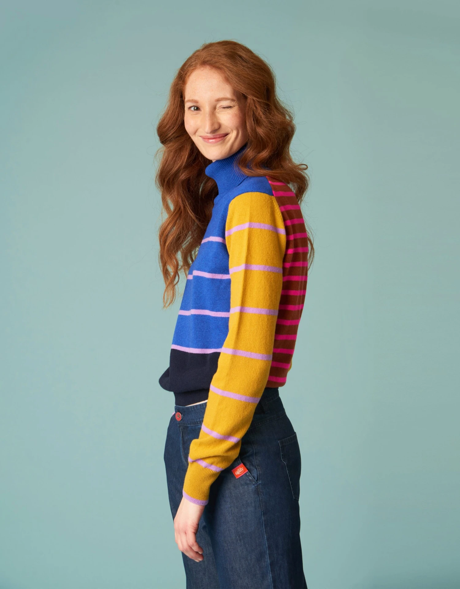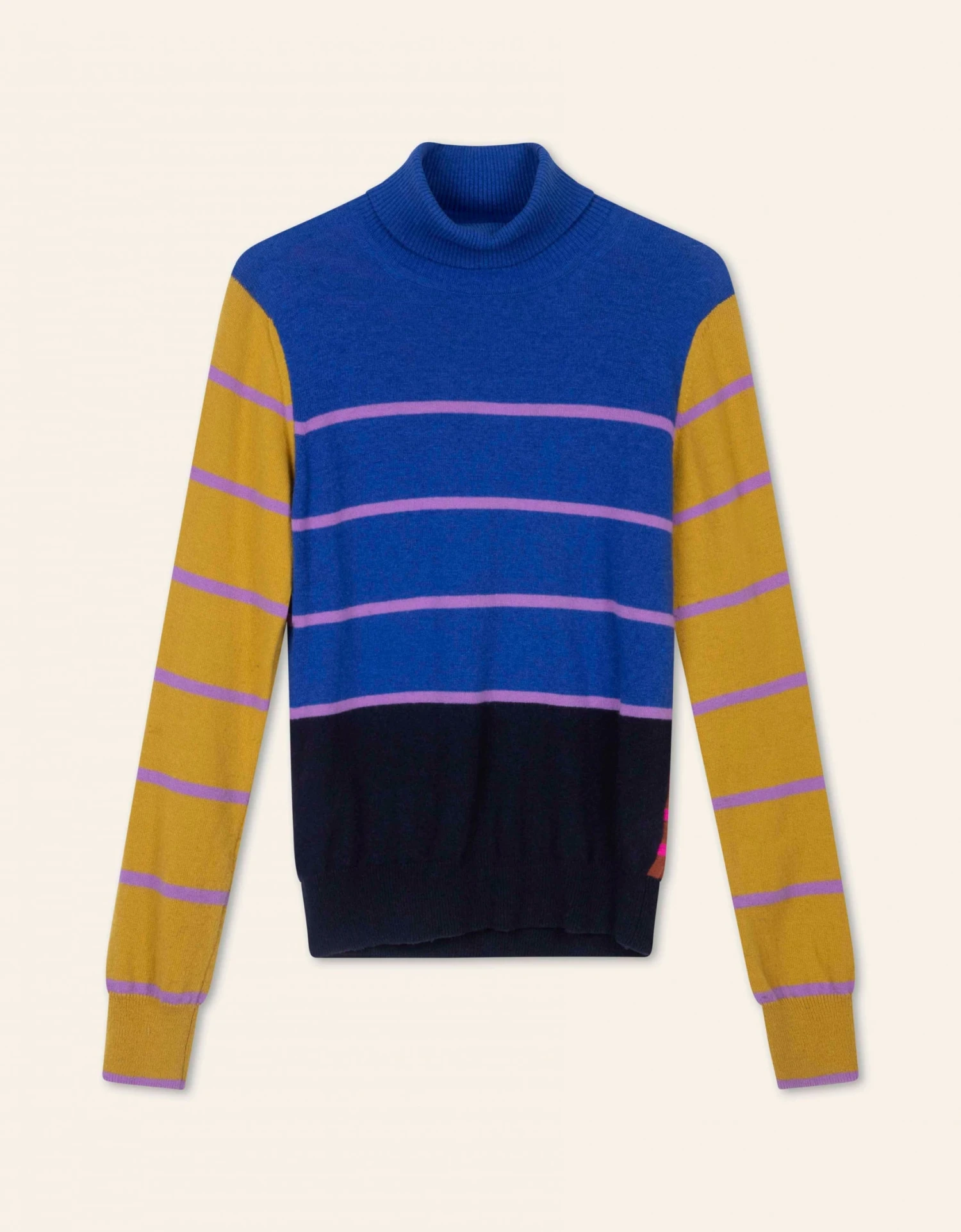 Vrolijke fitted pullover met een patchwork van strepen die je lekker warm houdt. De grote double-knitted col staat en zit erg prettig.