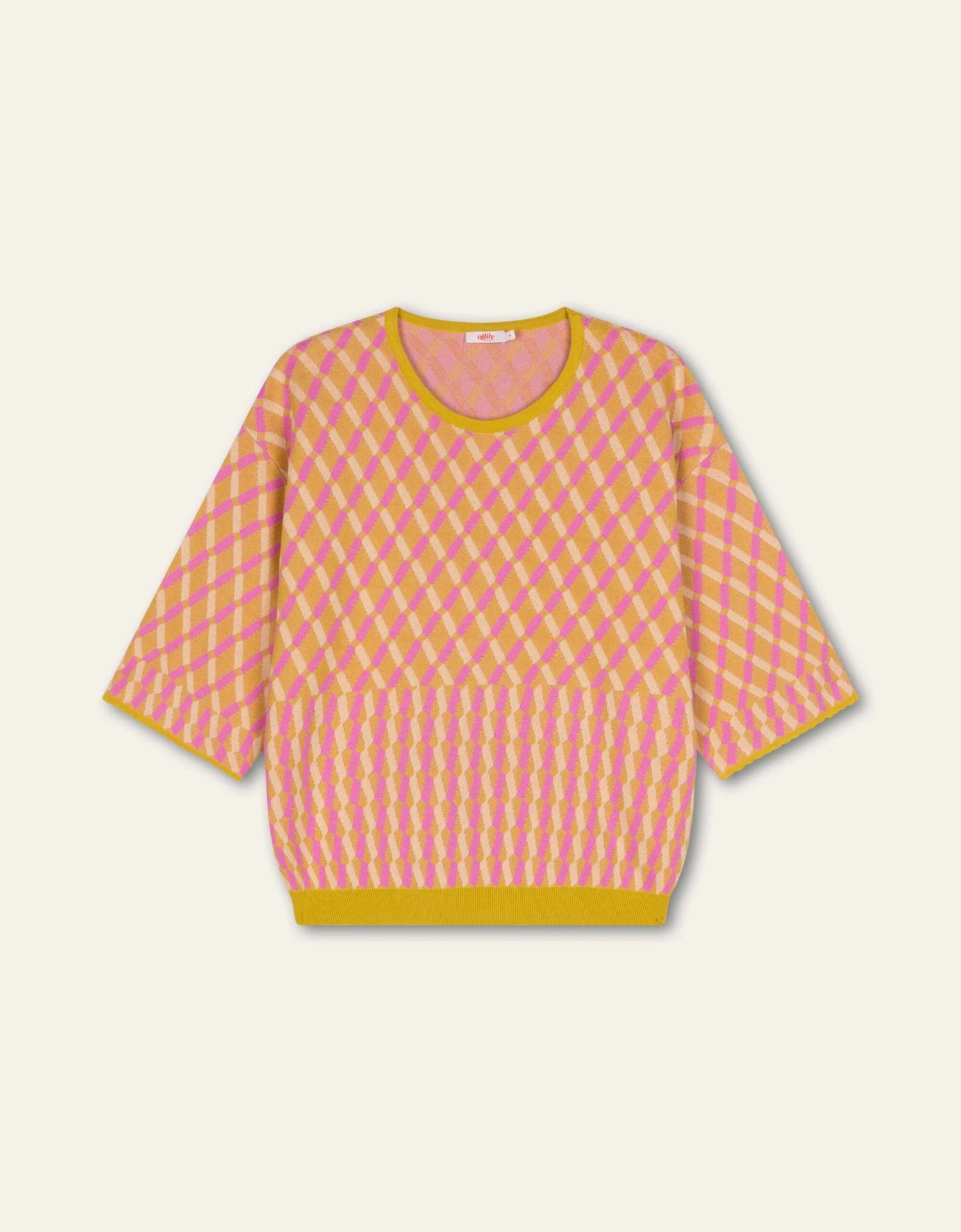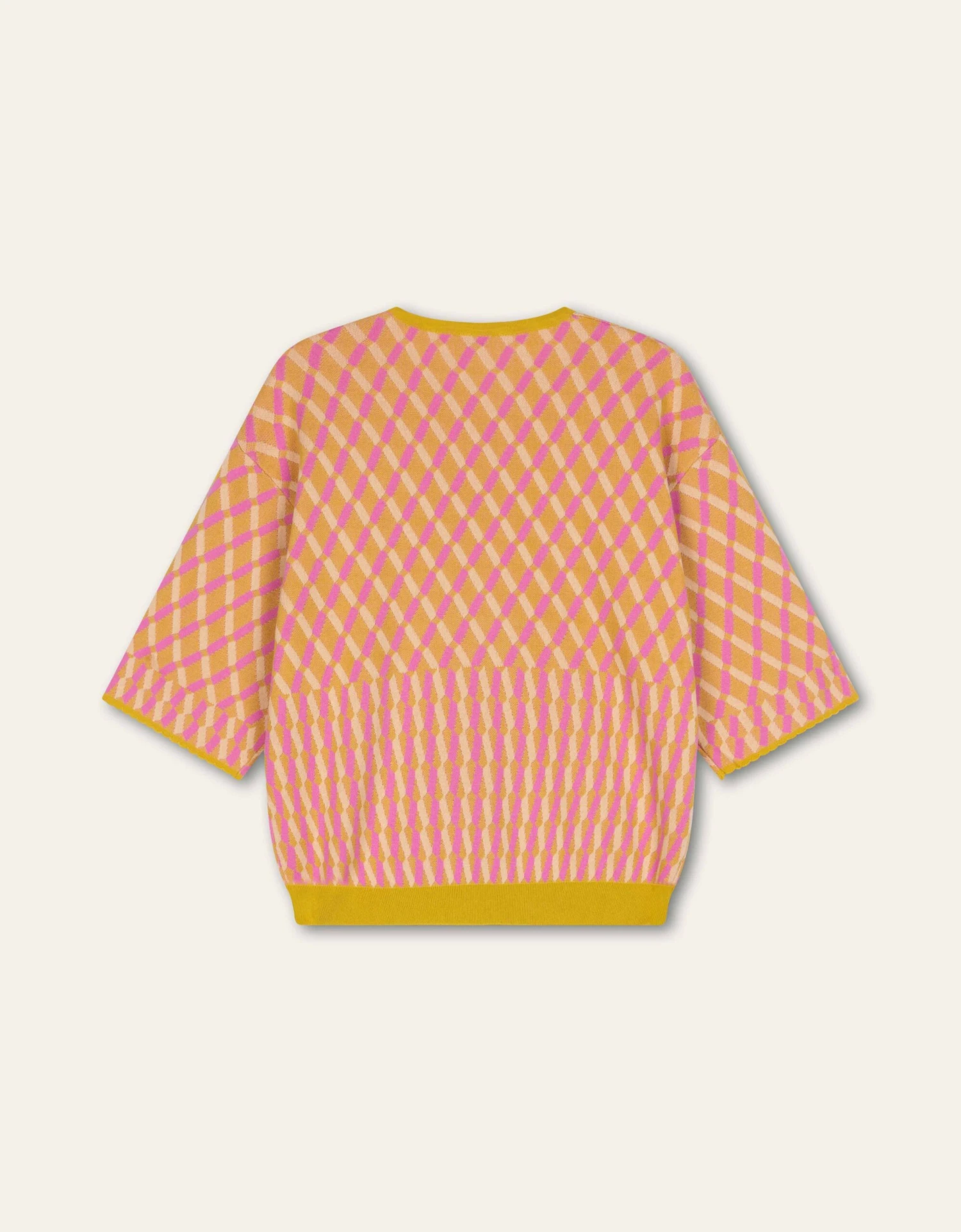 De relaxte fit maakt deze top uitermate geschikt voor ontspannen lentedagen. De verschillende steekpatronen boven en onder staan speels en uitnodigend. De mouwen hebben een driekwartlengte en zijn afgewerkt met schulpjes. We raden aan om knitwear opgevouwen in je kast te leggen en vooral niet op te hangen.