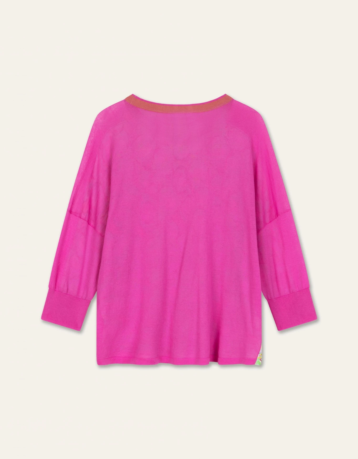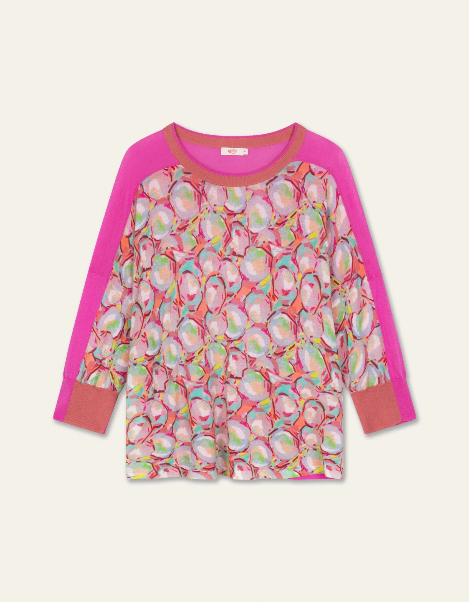 Een elegante, delicate pullover met driekwartmouwen met een speelse print op de voorkant en een uni-kleur achter. De print loopt door op de voorzijde van de mouwen. Hang het niet op, maar leg dit item op een plank in je kast om de vorm mooi te houden. – 100% Katoen