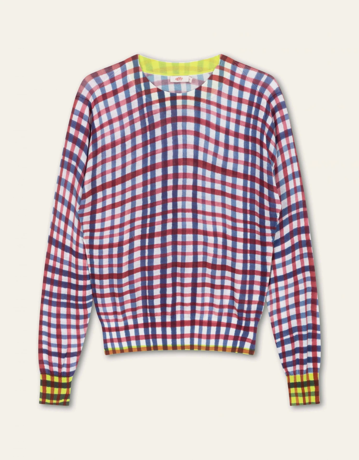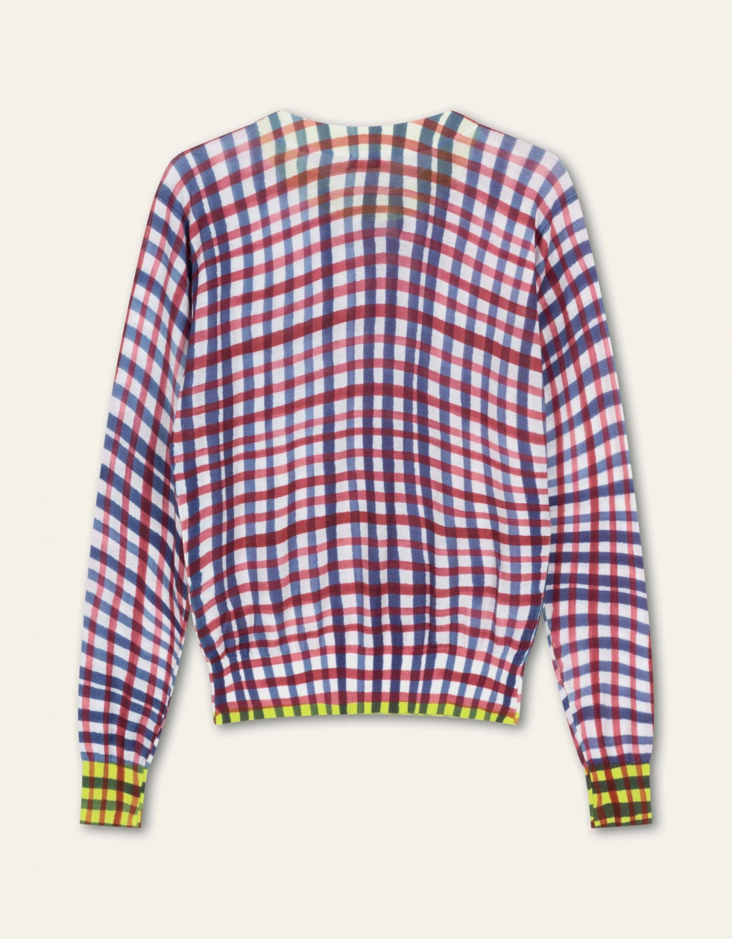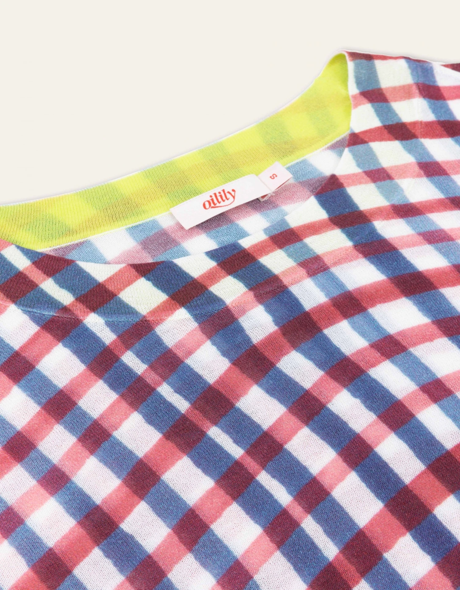 De ruitjes staan speels en voor extra lente vrolijkheid zie je aan de binnenkant van de hals, manchetten en zoom een felle contrast kleur.