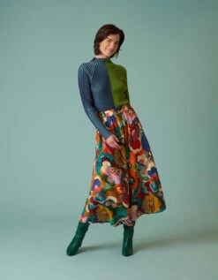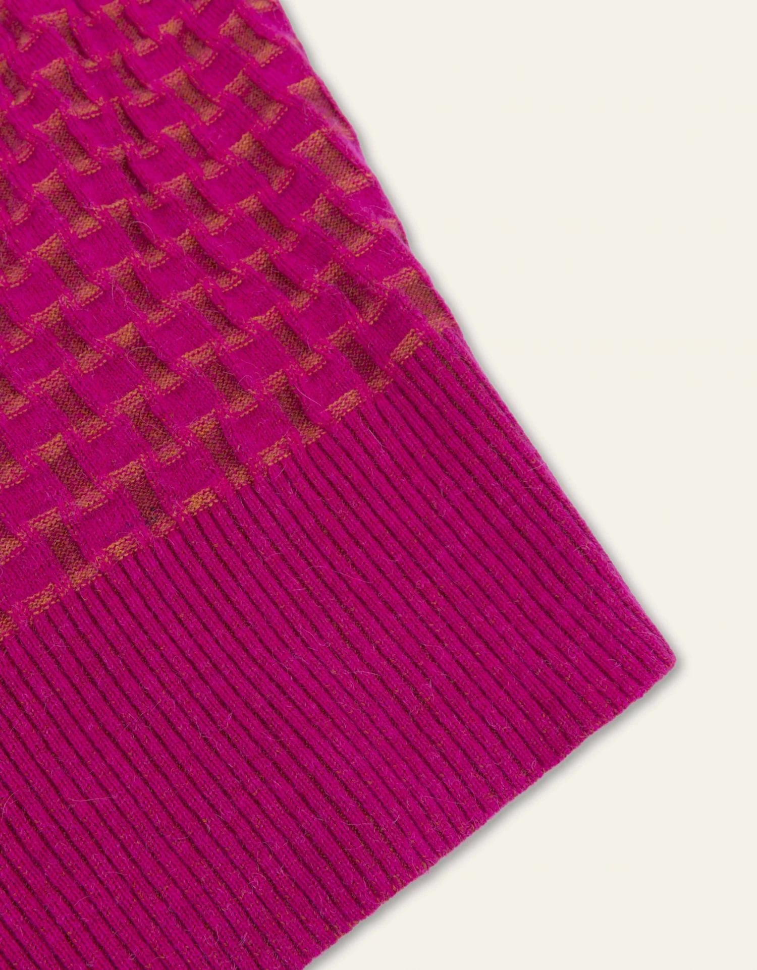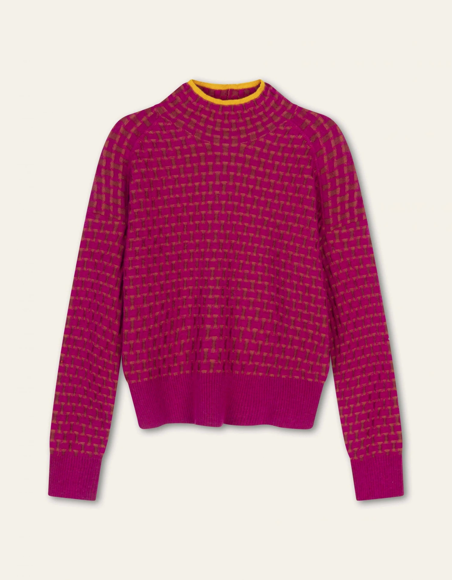 Een heerlijke, relaxed fitted pullover met een rechte vorm dat geheel in vorm gebreid is. Speelsheid vind je in het reliëf van het kleurrijke patroon en de contrast naad. De dropped shoulders zijn naar voren gebreid en de rand van de col heeft een vrolijke afwijkend kleurtje.
