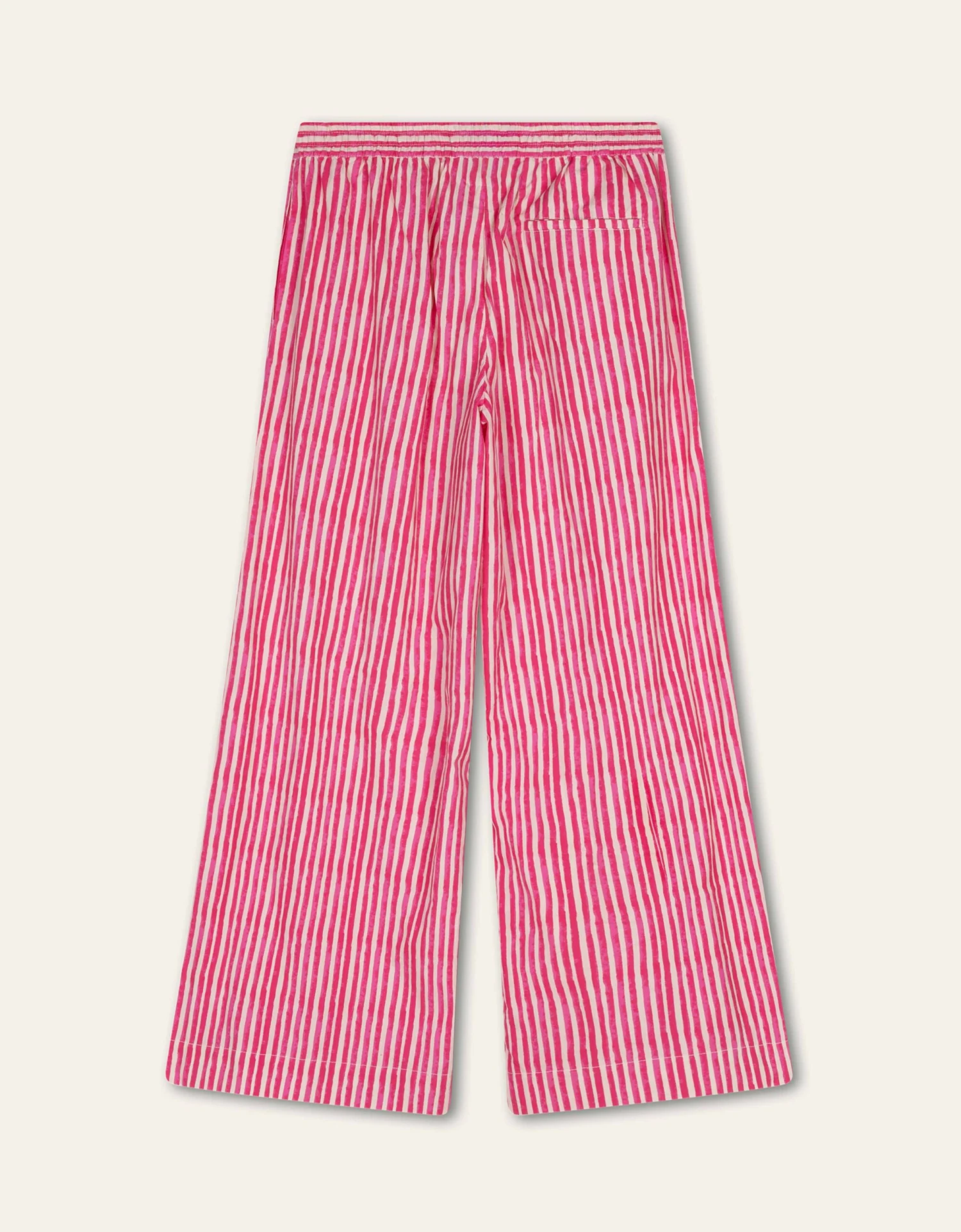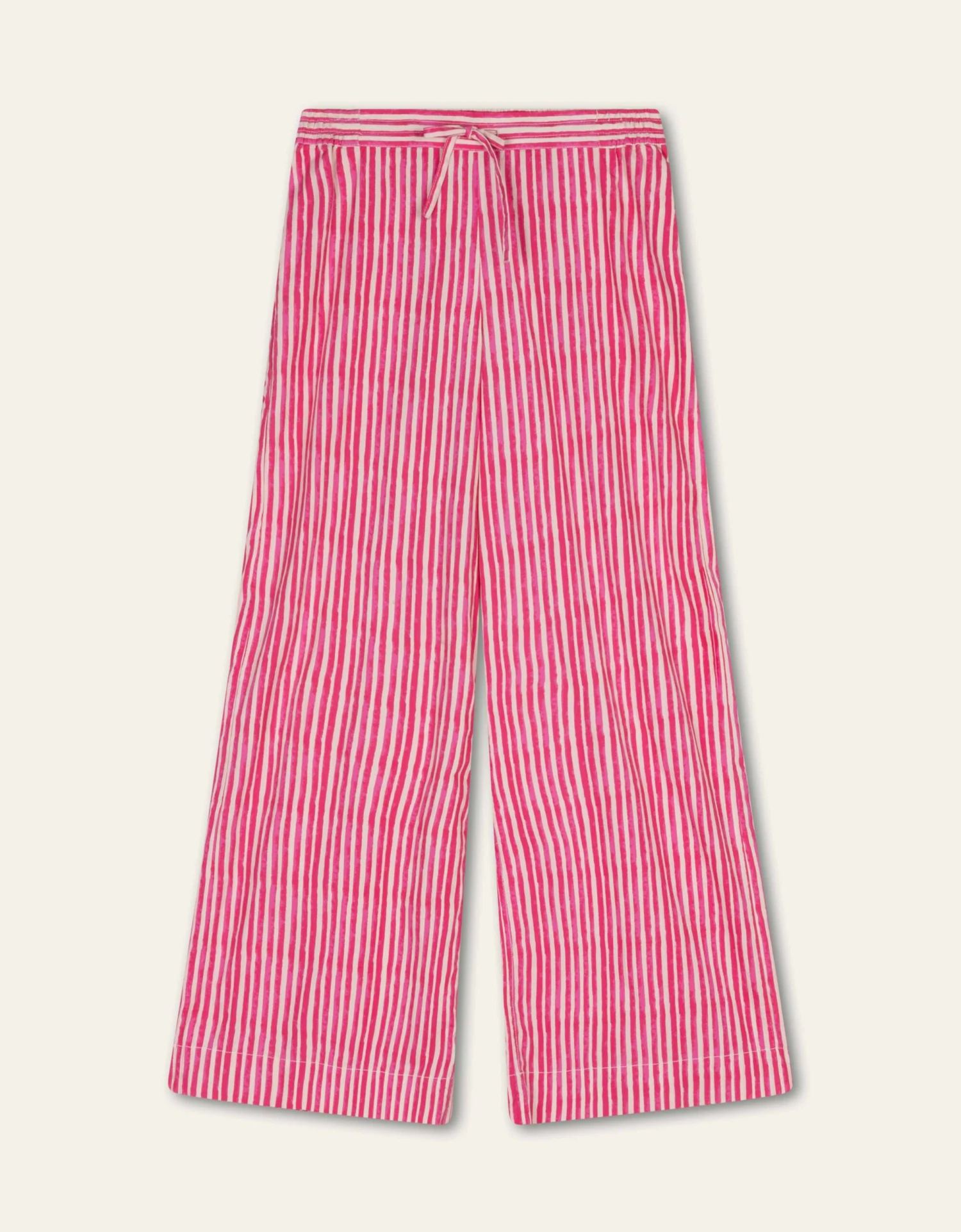 Katoenen broek met lange en wijdvallende pijpen, deze lengte wordt versterkt door de strepen. Dessin Willow Stripes tekenden we met de hand waardoor het een speelse onregelmatigheid heeft.
