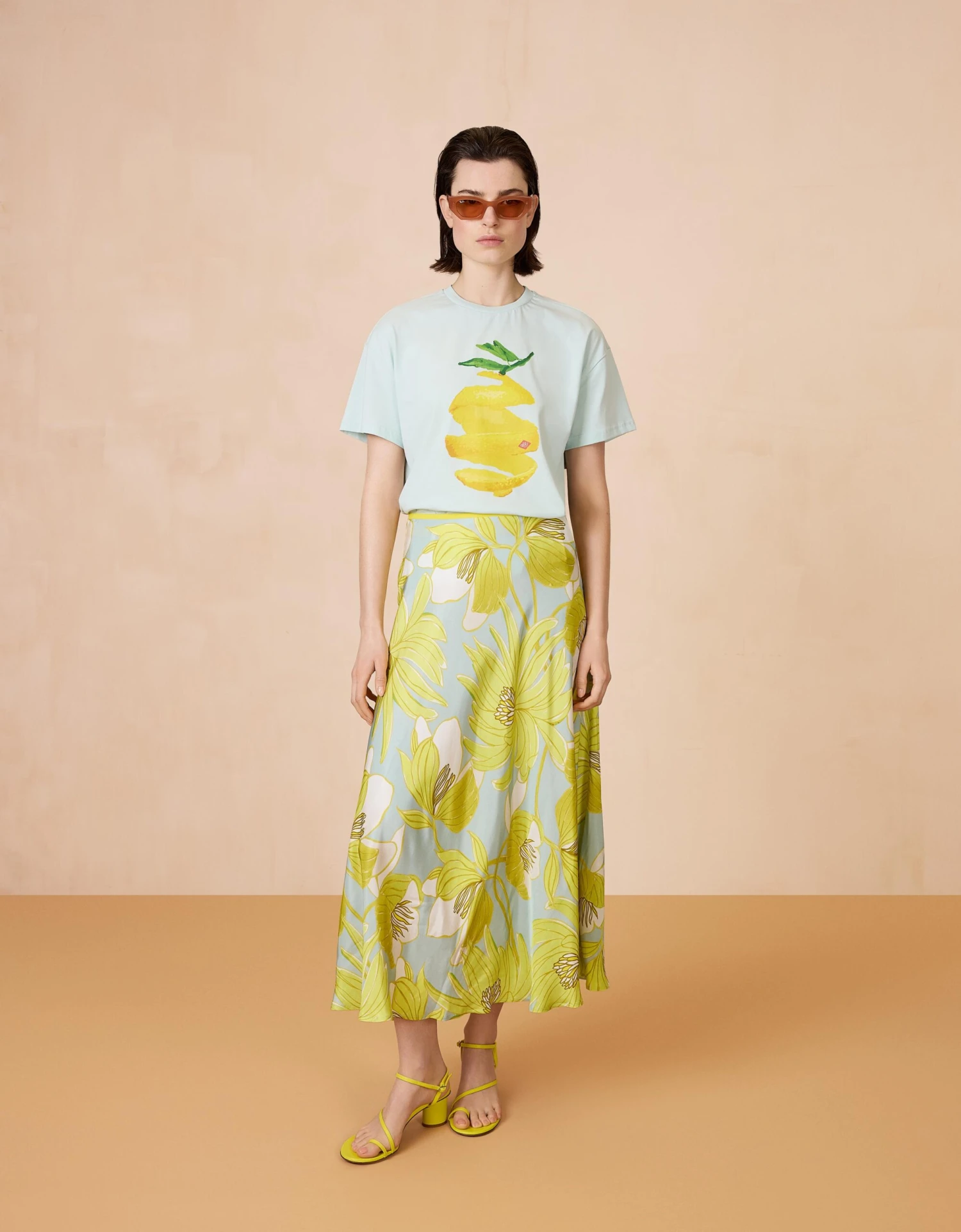 Door het dessin van deze rok schuin in te zetten, heeft de rok veel extra flair. De zachte elastische tailleband met onzichtbare rits zorgt voor comfortabel en effortless draaggemak.