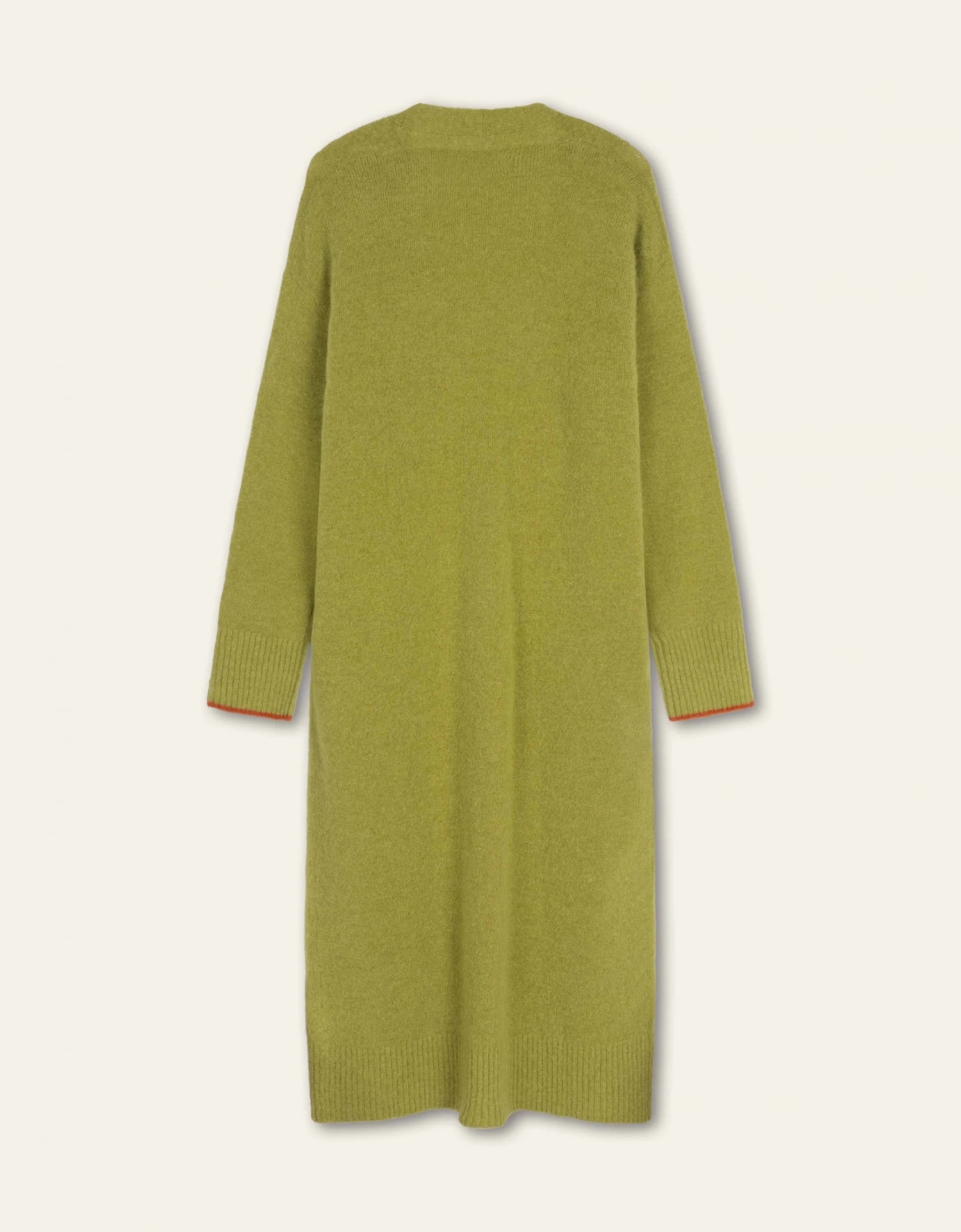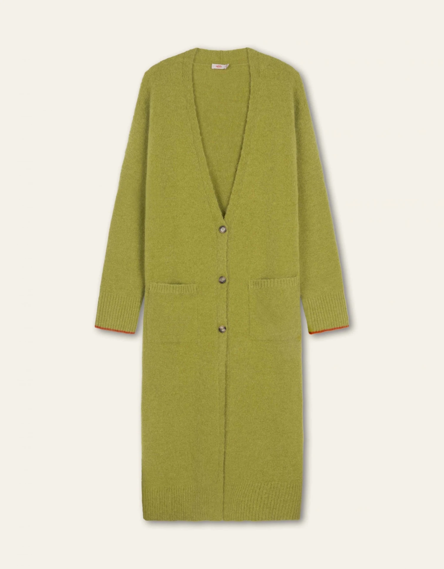Een najaarsgarderobe is niet compleet zonder maxi-vest. Dit lange vest met knopen is heel erg zacht en gebreid van Merino met Alpaca wol. Aan de voorkant twee zakken en langs de manchetten hebben we een andere kleur gebruikt voor een speels contrast.